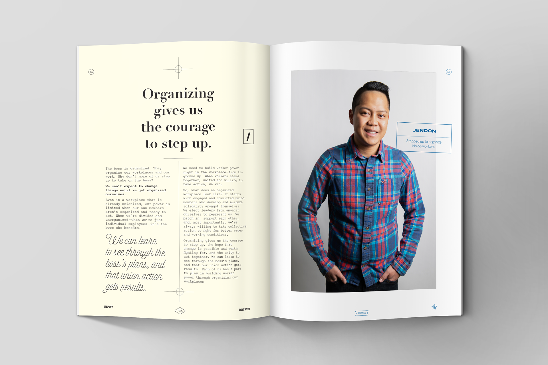 The Step Up! course, designed for the BC General Employees' Union (BCGEU), is a comprehensive introductory resource aimed at new union members. This document, through my design approach and portrait photography, serves as a visual and educational tool to enhance member engagement and understanding of the union's history, principles, and the rights of workers.